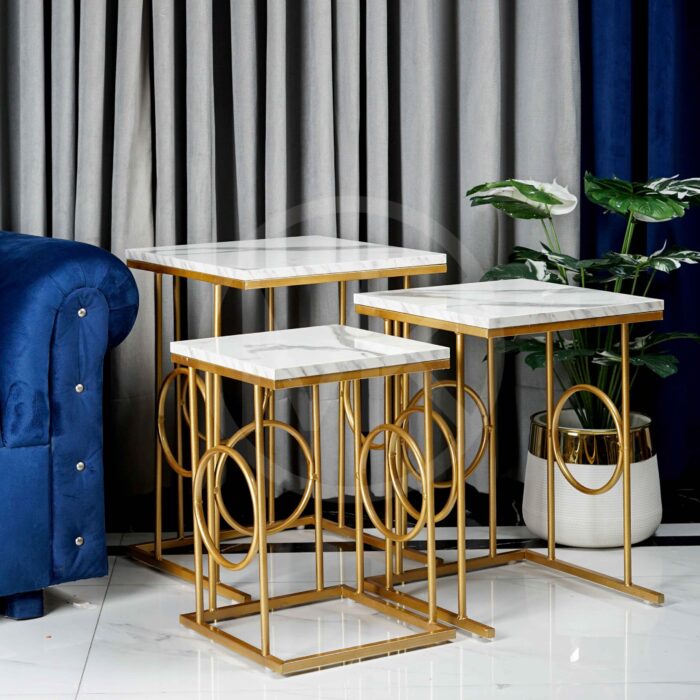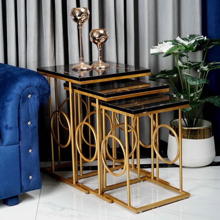 Elevate your living space with this stylish set of nesting tables, perfect for complementing any modern Pakistani interior. Each table features a sleek, high gloss MDF top, offering a sophisticated, polished finish that brings a touch of luxury to your décor. The sturdy metallic frames are coated with advanced Stormic Pro technology, providing exceptional durability and a refined, contemporary look. These versatile nesting tables are ideal for living rooms, bedrooms, or offices, offering functional surfaces for décor display or everyday use while saving space with their smart, stackable design. Crafted for the modern home, these nesting tables are available with nationwide delivery in Pakistan.