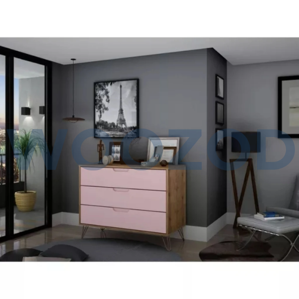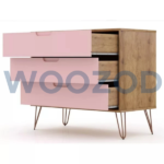 The Woozod BRUINE Wide Drawer Chest features a soft pink finish and stylish hairpin legs. With spacious drawers and a contemporary design, it adds both practicality and a playful, modern touch to any bedroom or living space.