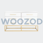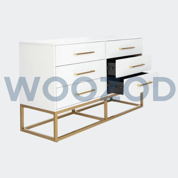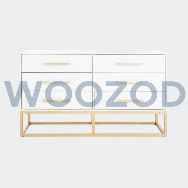 The Woozod CORBEL Chest of Six Drawers features a crisp white finish paired with an elegant golden metallic frame. With six spacious drawers, it offers functional storage and a luxurious touch to elevate any bedroom or living area.