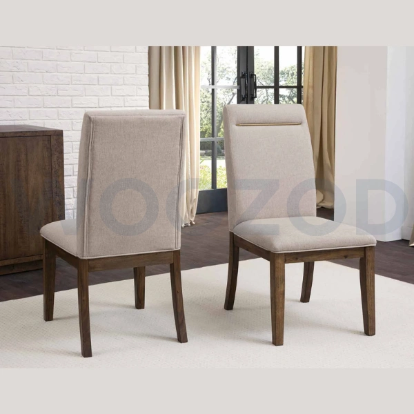 Each chair complements the table with beige jute upholstery, offering both softness and durability. The flared shaker-style legs provide stability, while the slanted backrest ensures superior comfort during long meals. To complete the sophisticated design, a golden strip tufted at the top of the backrest adds a subtle yet striking decorative accent. Together, these details make the Woozod FORTE a perfect harmony of modern artistry and practical design.