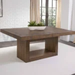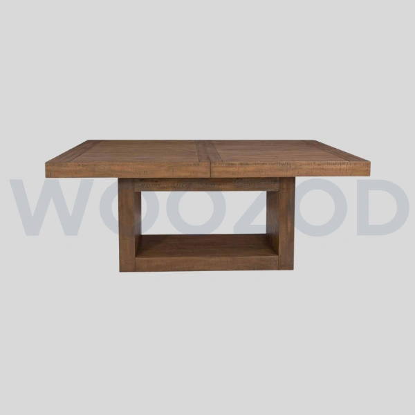 The rectangular dining table stands as the centerpiece of your home. It is crafted from a premium mix of solid and synthetic wood, offering both strength and a sleek look. The medium brown polish finish accentuates its natural grain while giving it a luxurious, glossy appearance. Additionally, the table’s unique cut-out base design adds architectural charm, creating a focal point that blends beautifully with modern interiors.