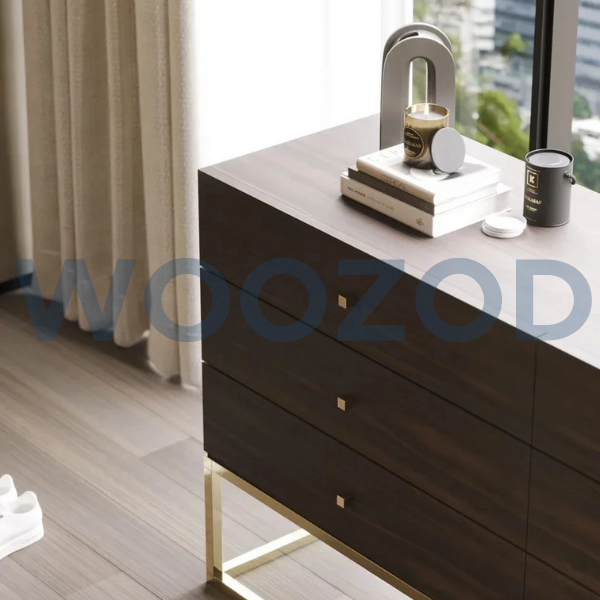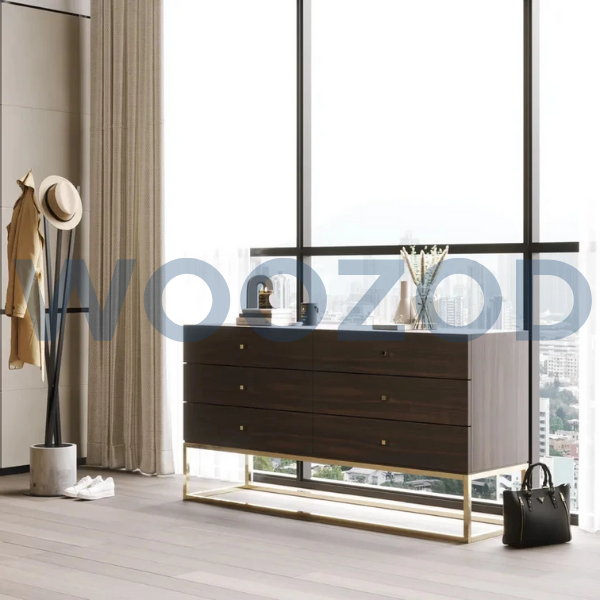 The Woozod LUNARIS Chest of Drawers features a rich brown finish with elegant golden accents and a sturdy metal frame. Designed for both style and storage, it offers spacious drawers and classic sophistication for any bedroom or living space.