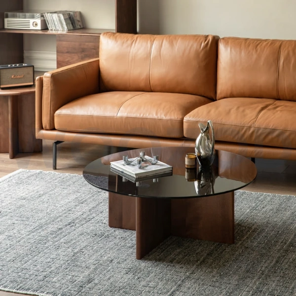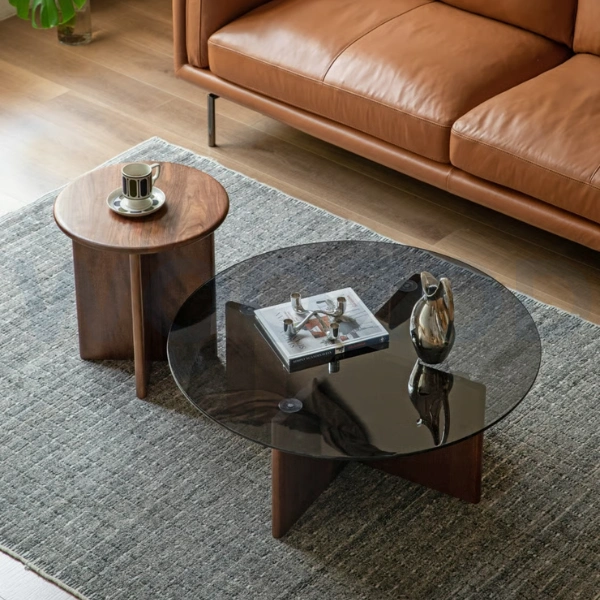 Each table features a tempered tinted glass top that adds a subtle contrast to the wooden frame. The glass surface not only adds visual lightness but also ensures durability and easy maintenance. Designed to last for years, this nesting set offers practicality and beauty in equal measure.