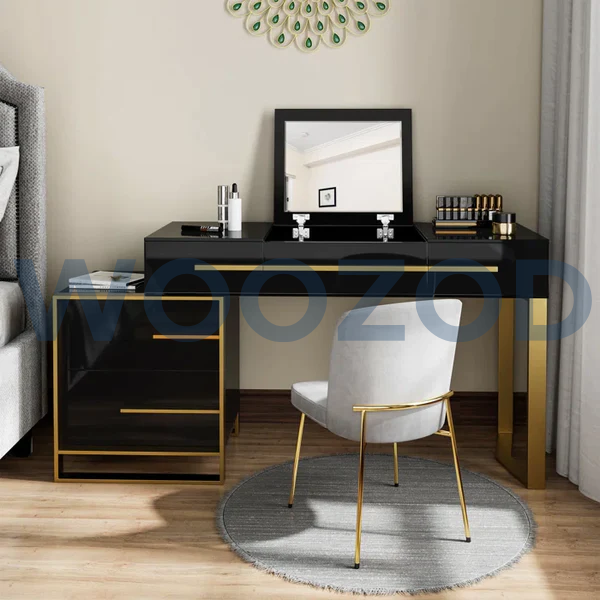 The vanity features three smooth sliding drawers designed to store makeup, perfumes, and personal accessories neatly. In addition, the spacious tabletop provides ample room for beauty products or office essentials. As a result, the dresser keeps your space tidy while offering easy access to your belongings.
